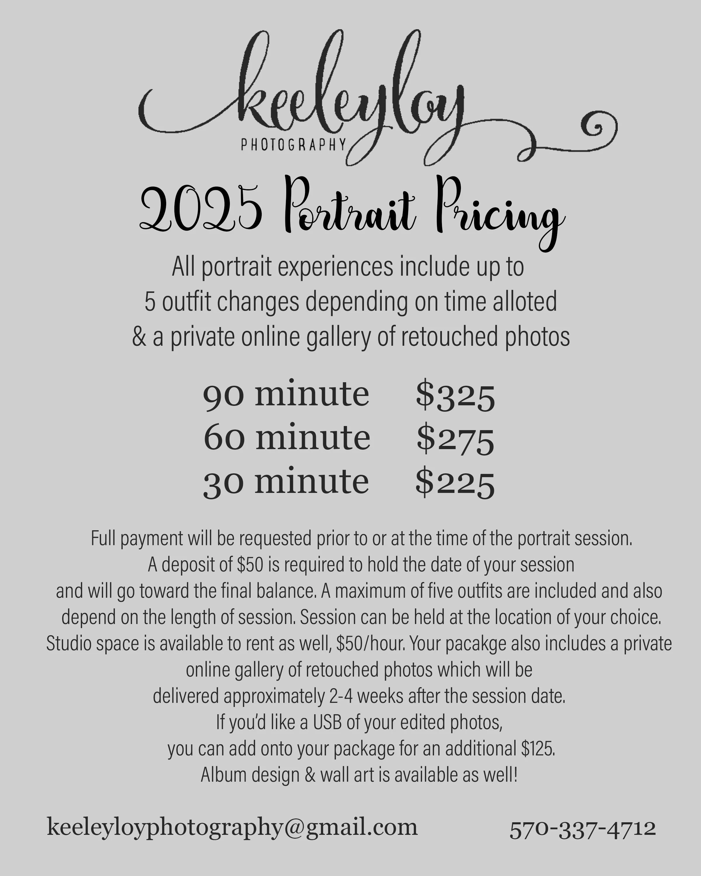 Thank you for your interest in booking a session with me! Below you will find all of my pricing. *If you are looking for wedding packages, I would love to chat more with you to match your day with the best coverage.